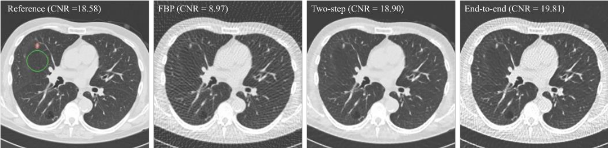 저자는 본 논문의 end-to-end 방식을 기존의 FBP, Two-step 방식과 Reference와 비교해서 결과를 보여줍니다.
