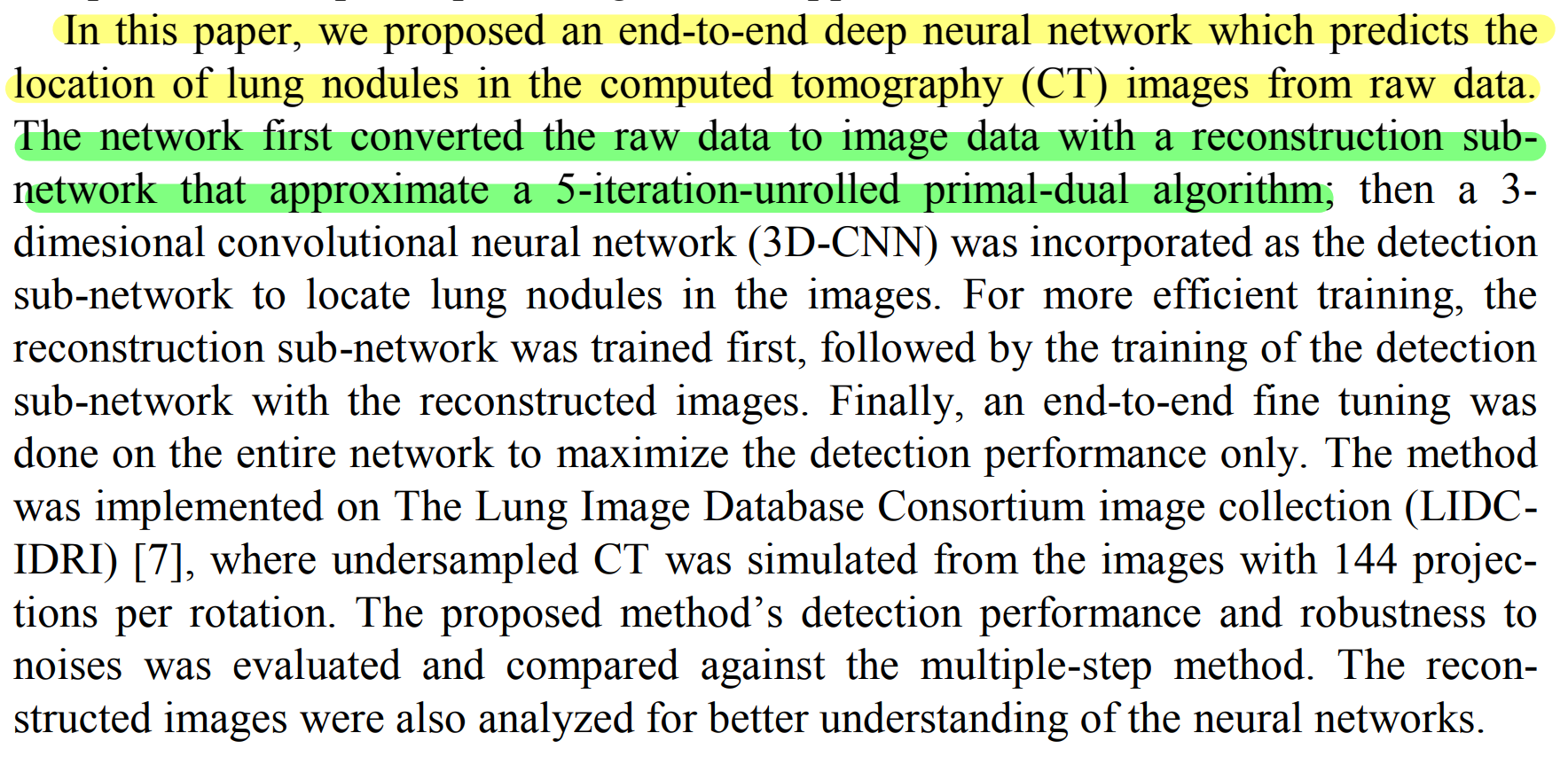 ● 본 논문에서는 multiple-step learning이 아닌 end-to-end방식을 이용하여 raw data에서 image로 reconstruction 시킨 뒤 lung nodule을 detection하는 방식을 제안하였습니다.