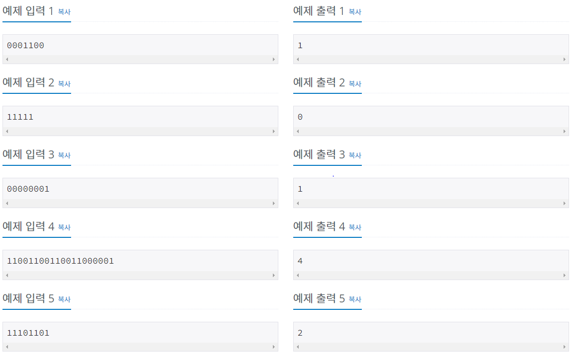 다솜이는 0과 1로만 이루어진 문자열 S를 가지고 있다. 다솜이는 이 문자열 S에 있는 모든 숫자를 전부 같게 만들려고 한다. 다솜이가 할 수 있는 행동은 S에서 연속된 하나 이상의 숫자를 잡고 모두 뒤집는 것이다. 뒤집는 것은 1을 0으로, 0을 1로 바꾸는 것을 의미한다.