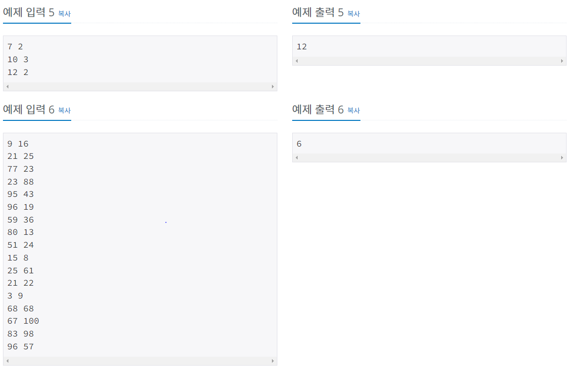 첫째 줄에 N과 M이 주어진다. N은 100보다 작거나 같은 자연수이고, M은 50보다 작거나 같은 자연수이다. 둘째 줄부터 M개의 줄에는 각 브랜드의 패키지 가격과 낱개의 가격이 공백으로 구분하여 주어진다. 가격은 0보다 크거나 같고, 1,000보다 작거나 같은 정수이다.