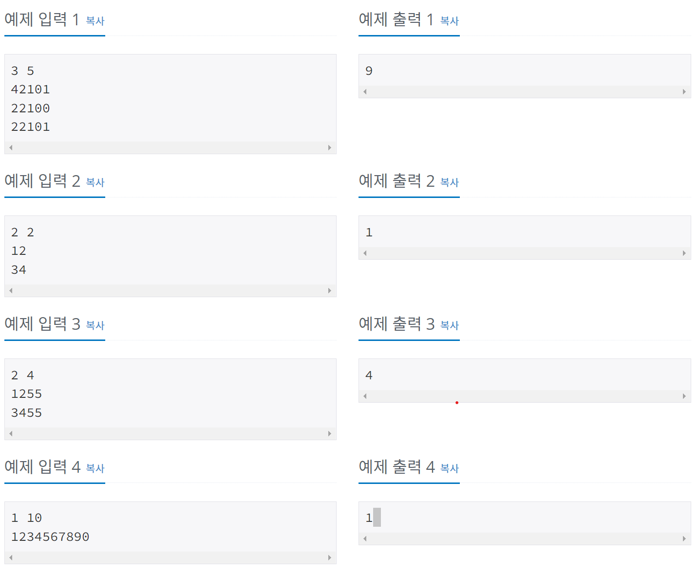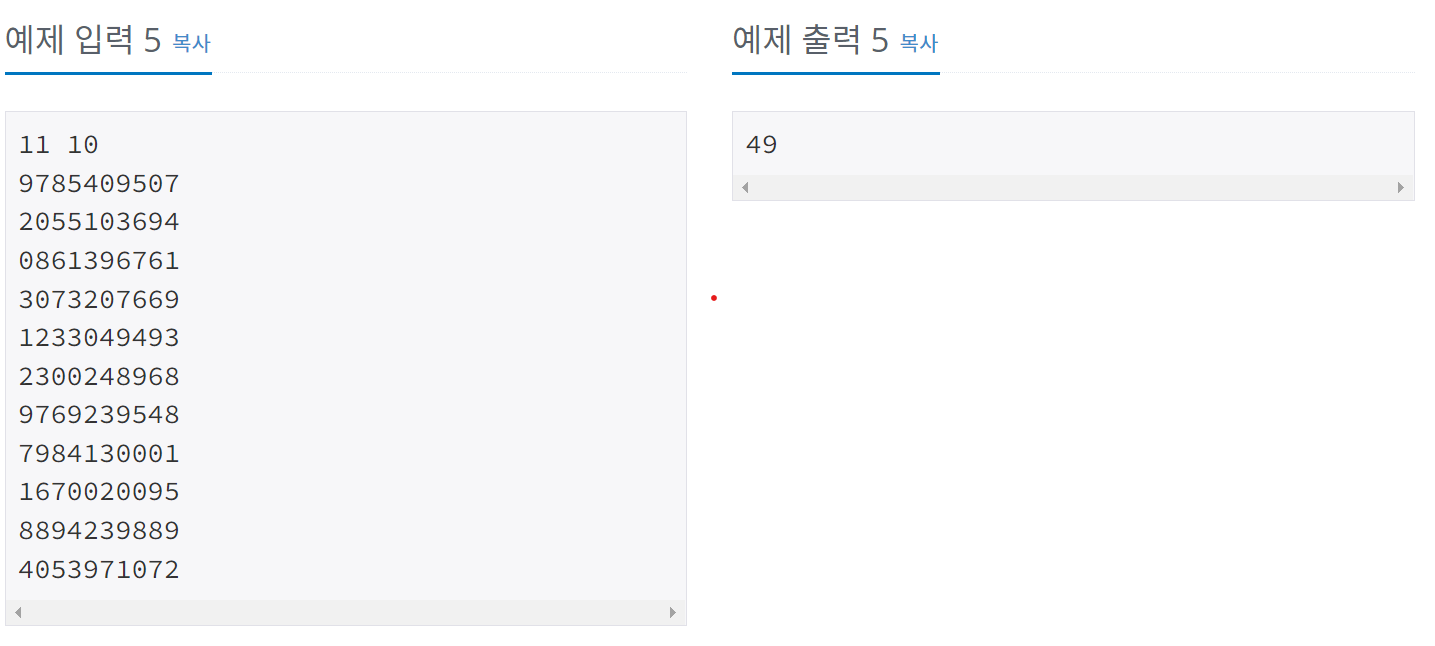 첫째 줄에 N과 M이 주어진다. N과 M은 50보다 작거나 같은 자연수이다. 둘째 줄부터 N개의 줄에 수가 주어진다.