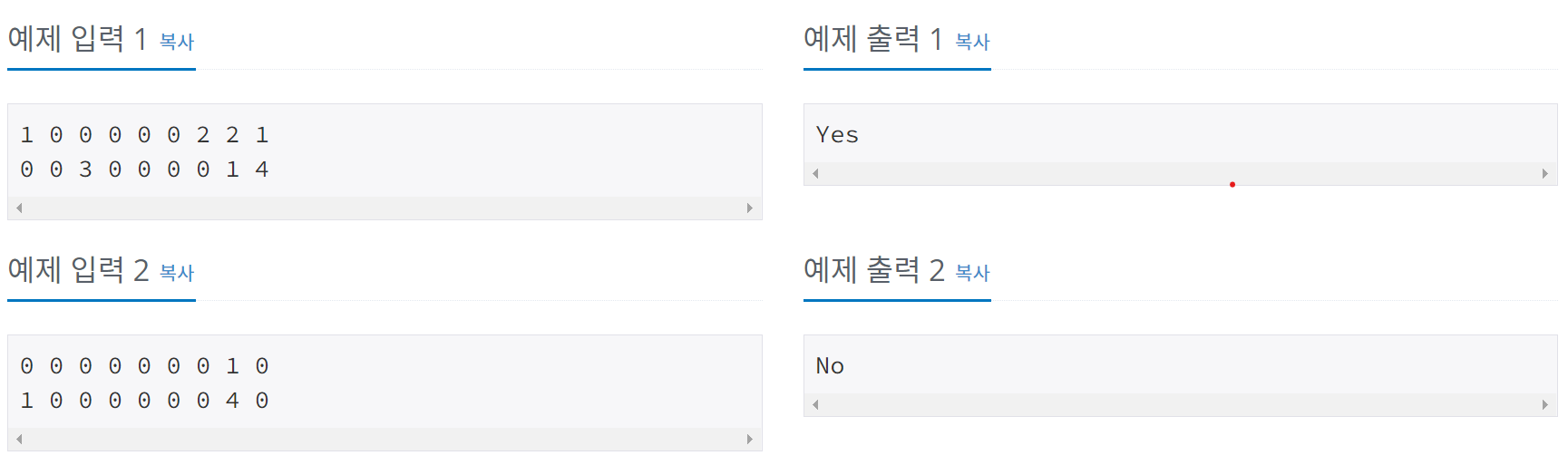 첫 번째 줄에는 9개의 정수가 주어지는데, 오늘 경기에서 울림 제미니스가 1회 초, 2회 초, ..., 9회 초에 낸 득점이 주어진다. 두 번째 줄에도 9개의 정수가 주어지는데, 스타트링크 걸리버스가 1회