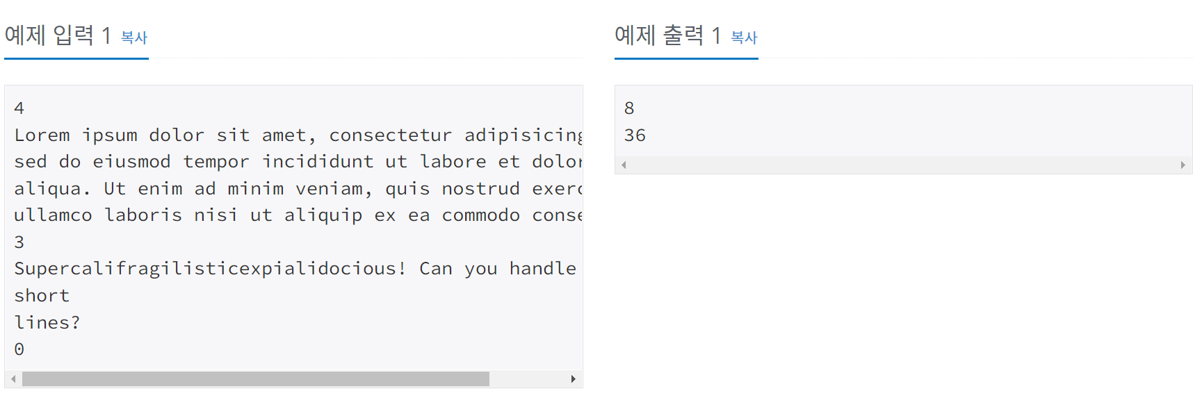 There will be several test cases in the input. Each test case will begin with an integer n (1≤n≤1,000) on its own line, indicating the number of lines of text. On each of the next n lines will be text, consisting of printable ASCII characters and space