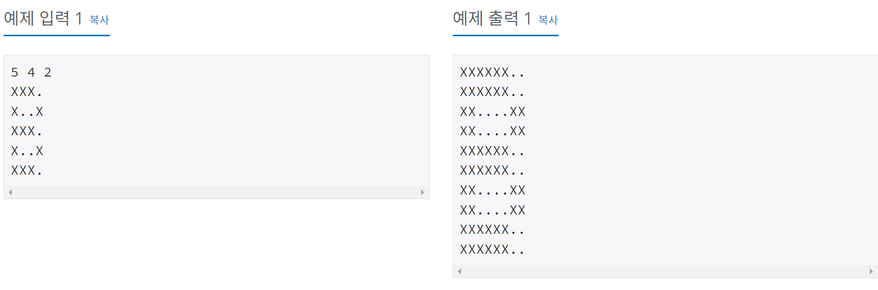 Bessie and her cow friends are playing as their favorite cow superheroes. Of course, everyone knows that any self-respecting superhero needs a signal to call them to action. Bessie has drawn a special signal on a sheet of M×N paper (1≤M≤10,1≤N≤10), but this is too small, much too small! Bessie wants to amplify the signal so it is exactly K times bigger (1≤K≤10) in each direction.