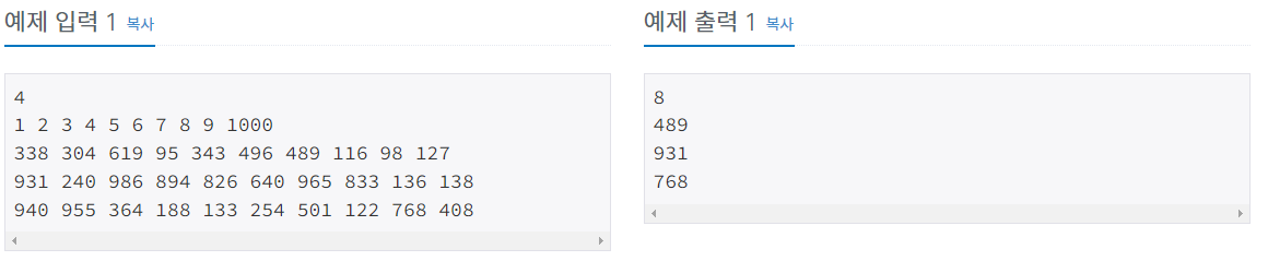 첫째 줄에 테스트 케이스의 개수 T(1 ≤ T ≤ 1,000)가 주어진다. 각 테스트 케이스는 한 줄로 이루어져 있고, 배열 A의 원소 10개가 공백으로 구분되어 주어진다. 이 원소는 1보다 크거나 같고, 1,000보다 작거나 같은 자연수이다.